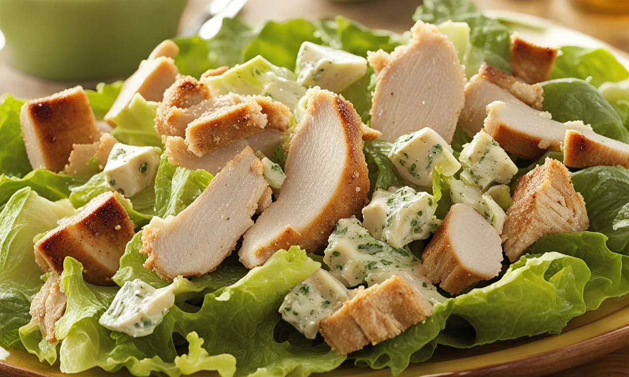 Let’s start with our classic Caesar chicken salad. With crisp romaine lettuce, juicy grilled chicken, tangy Parmesan cheese, and creamy Caesar dressing, this salad is a timeless favorite that never disappoints.